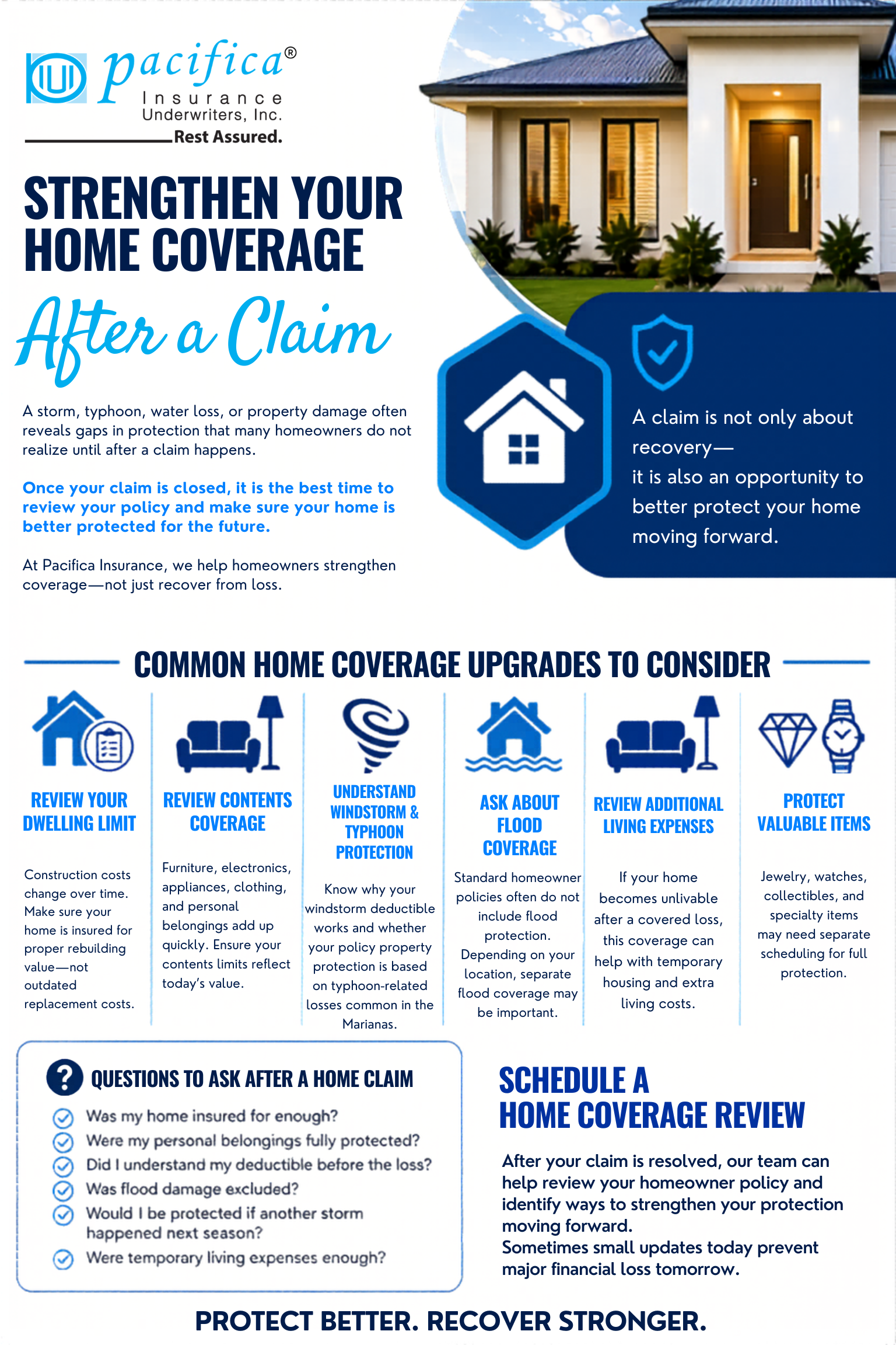 Depending on the type of claim, Pacifica may assist with the initial review and documentation support and may partner with the insurance carrier to help coordinate inspections.